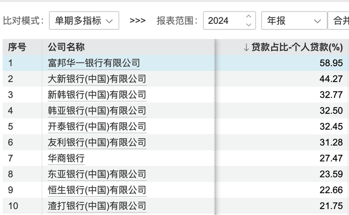 从个贷业务占比看,上述银行多属相对重视零售业务的外资行。2024年,富邦华一银行个人贷款达到403.27亿元,个人贷款占比58.95%,占比情况位居41家外资银行榜首,同时也是唯一一家个贷业务占比过半的外资行。